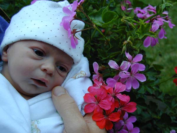 "Little" Anya joined us on Thursday April 6, 2000 at 8:25 am after a 29 hour labor.  It was a grand entrance, full of energy and excitement!  The picture to the lower left was taken when she was ten hours old.